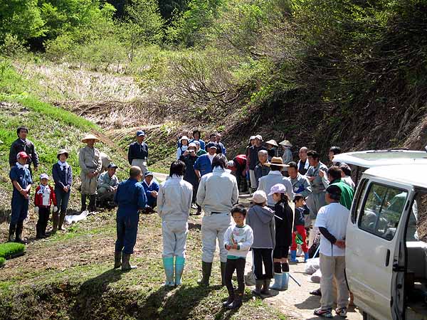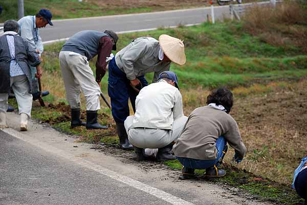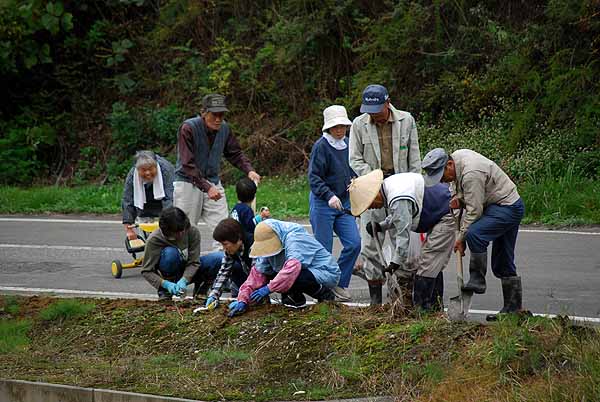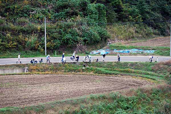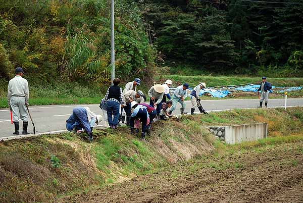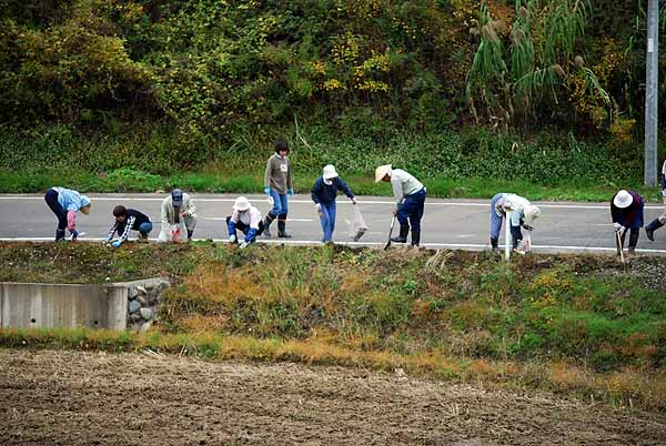 冬井の町内を市花の水仙で覆い尽くそうと毎年収穫祭と合わせて水仙の球根を植えています。 今までに約5000個を植えました。球根植えをした後は、みんなで今年の収穫を喜び、おいしいひと時を過ごします。